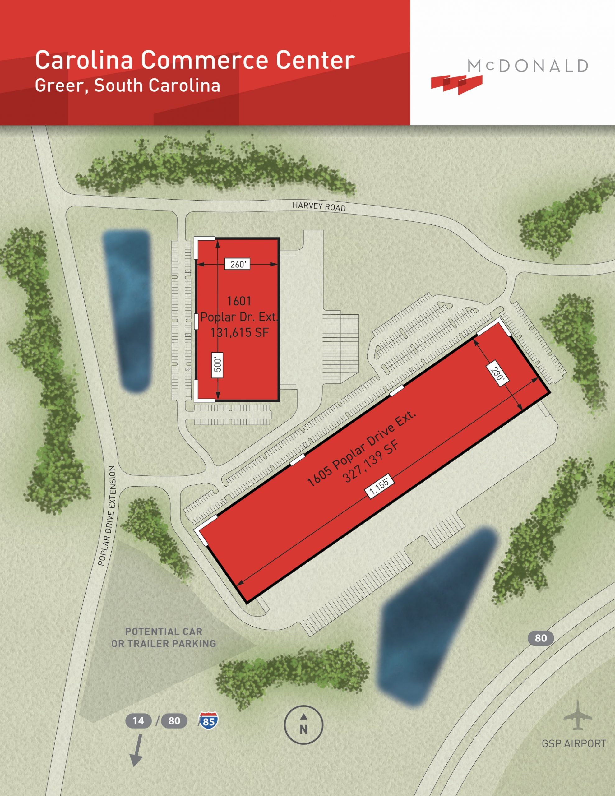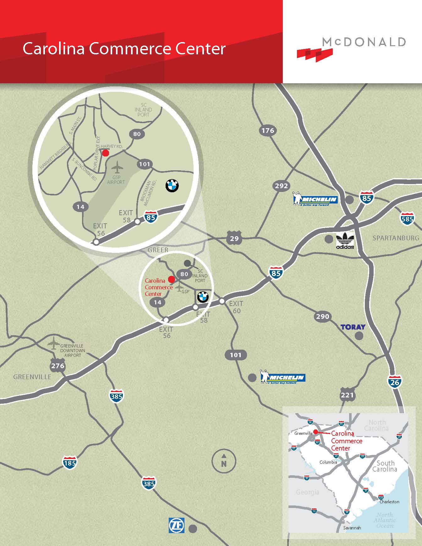 Carolina Commerce Center is a 42.71-acre industrial park developed by McDonald in 2020. The park is located in Greenville/Spartanburg, South Carolina, on Poplar Drive Extension with convenient access to I-85 via Highway 80, Highway 14 and Highway 101, or via Brockman McClimon Road, and within approximately two miles of the BMW plant, the Greenville-Spartanburg International Airport and the South Carolina Ports’ Inland Port – Greer. The park contains two Class A rear-load industrial buildings totaling 458,754 square feet. With high car parking counts and ample trailer parking available, the buildings were designed for single or multi-tenant distribution and manufacturing users. McDonald sold the park in 2022.