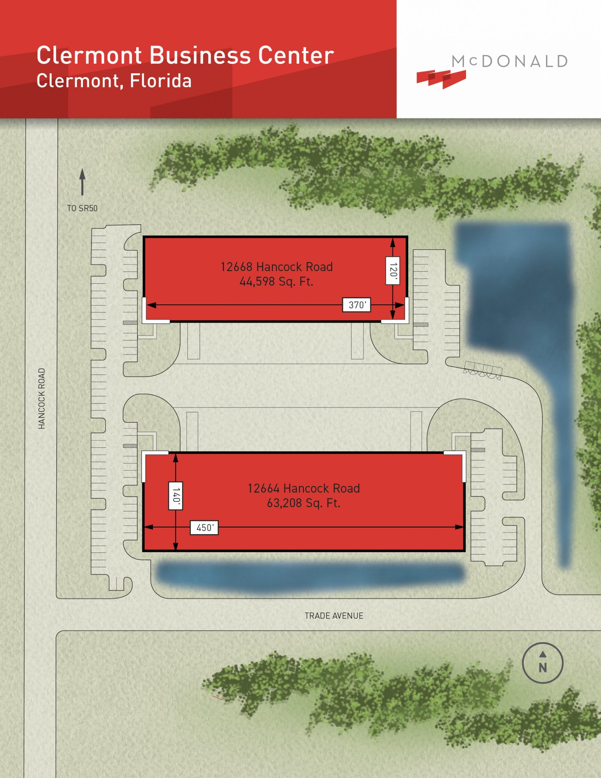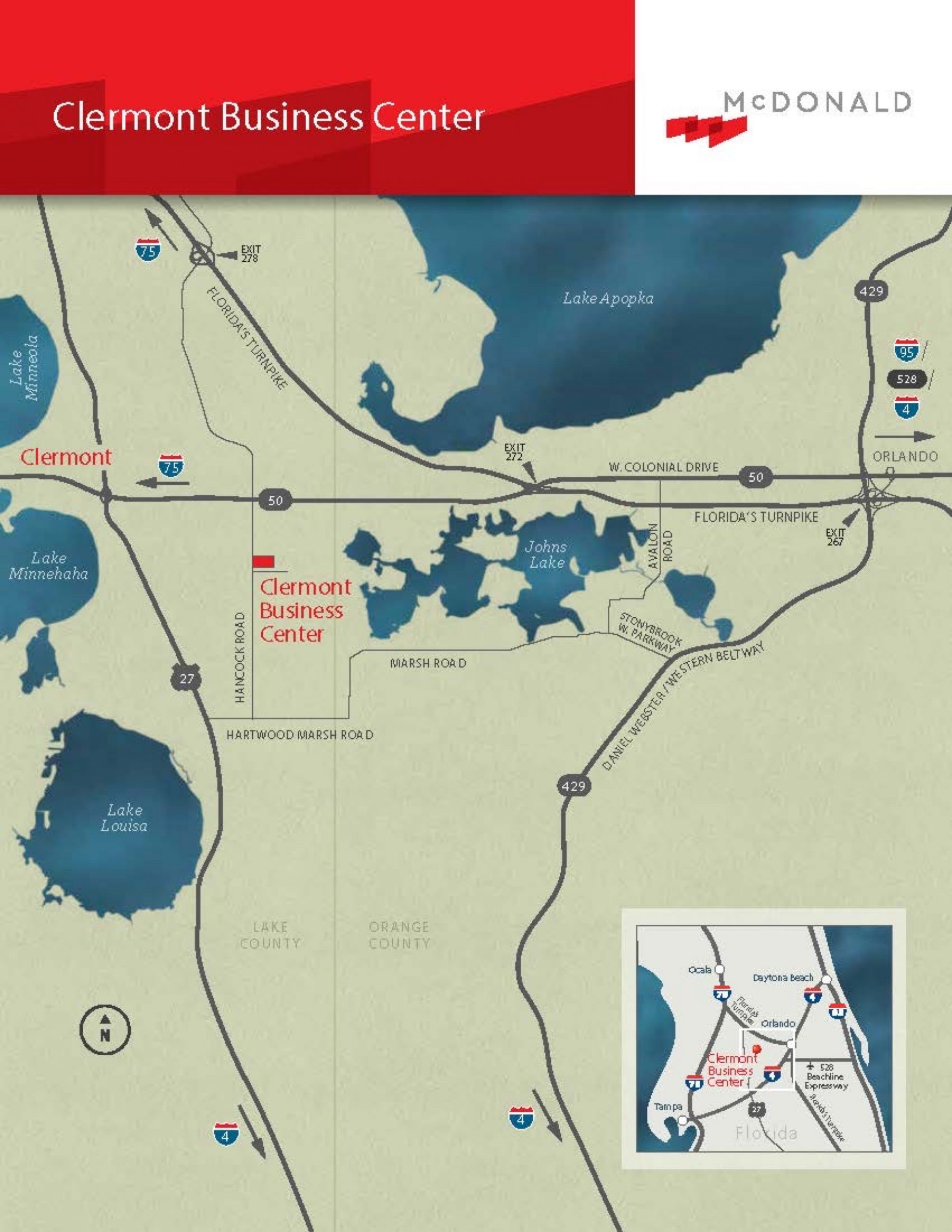 Clermont Business Center is a 9.4-acre business park developed by McDonald in 2019. The park is located in Clermont, Florida, just south of SR 50 near Orlando with convenient access to I-75, I-95, I-4, and Florida’s Turnpike.  Completed in 2019, the park contains two front-load, Class A, warehouse distribution buildings totaling 107,806 square feet.  McDonald sold the park in 2021.