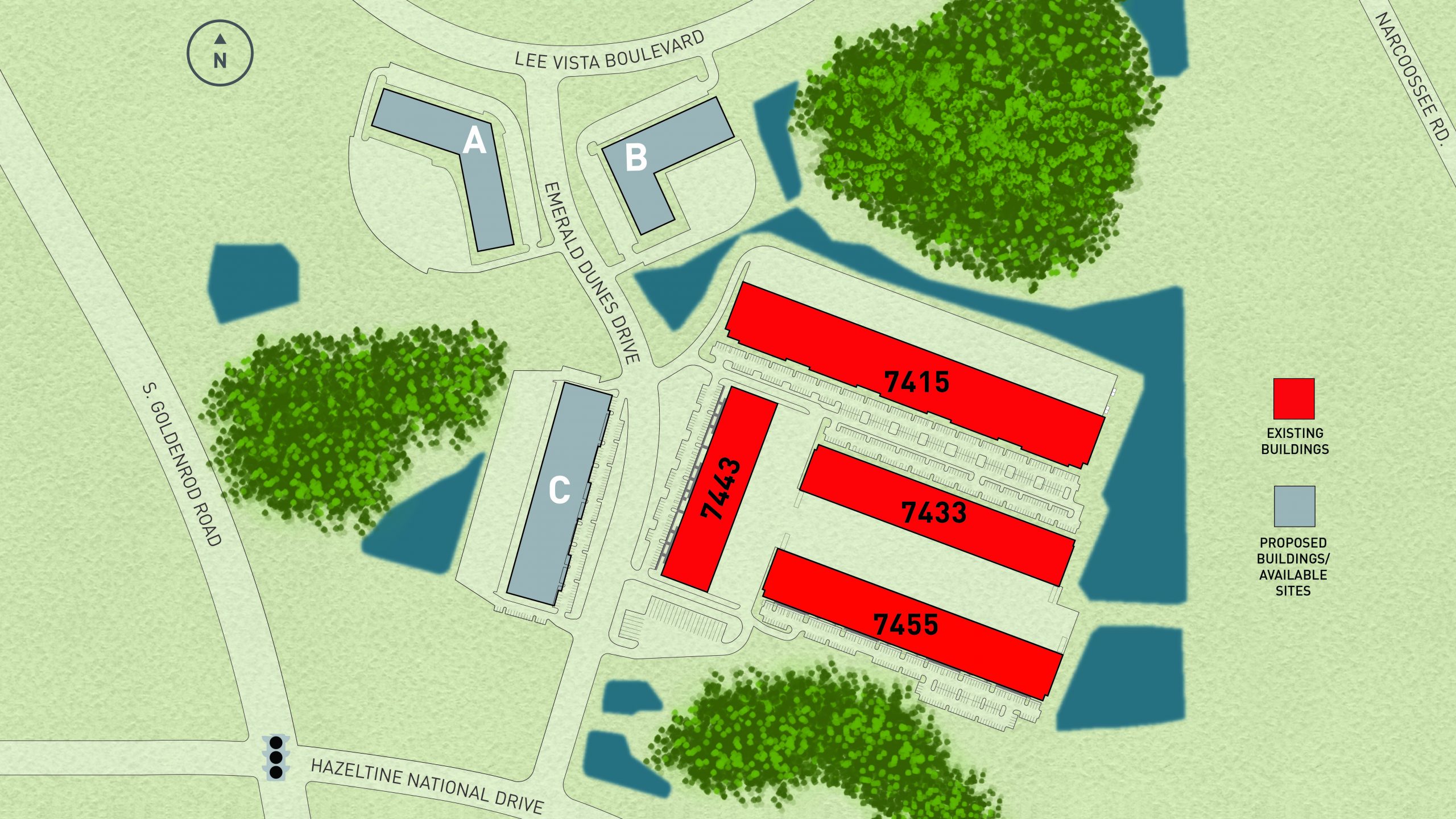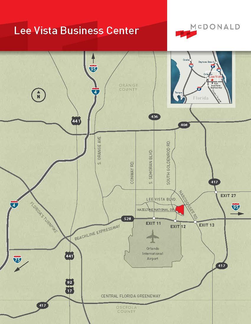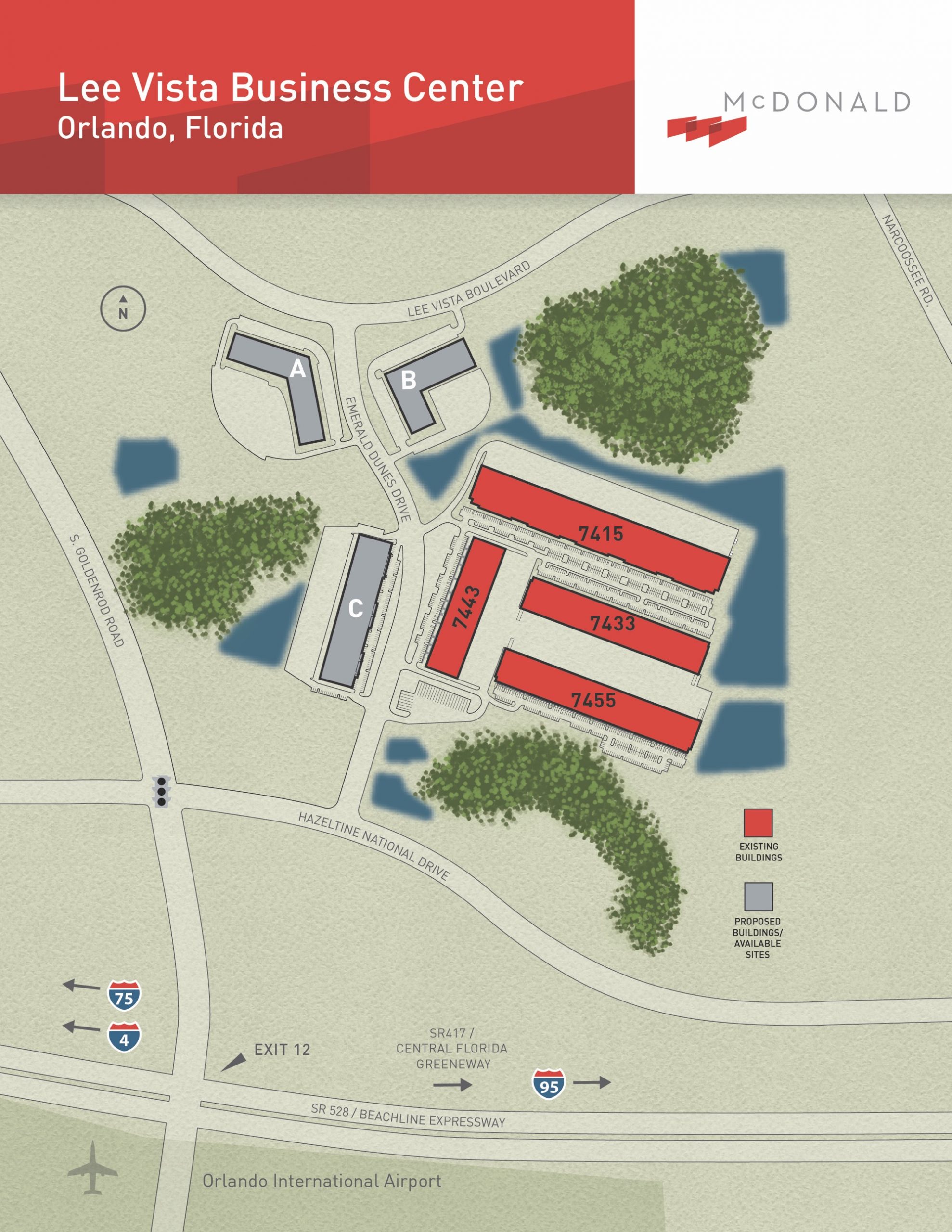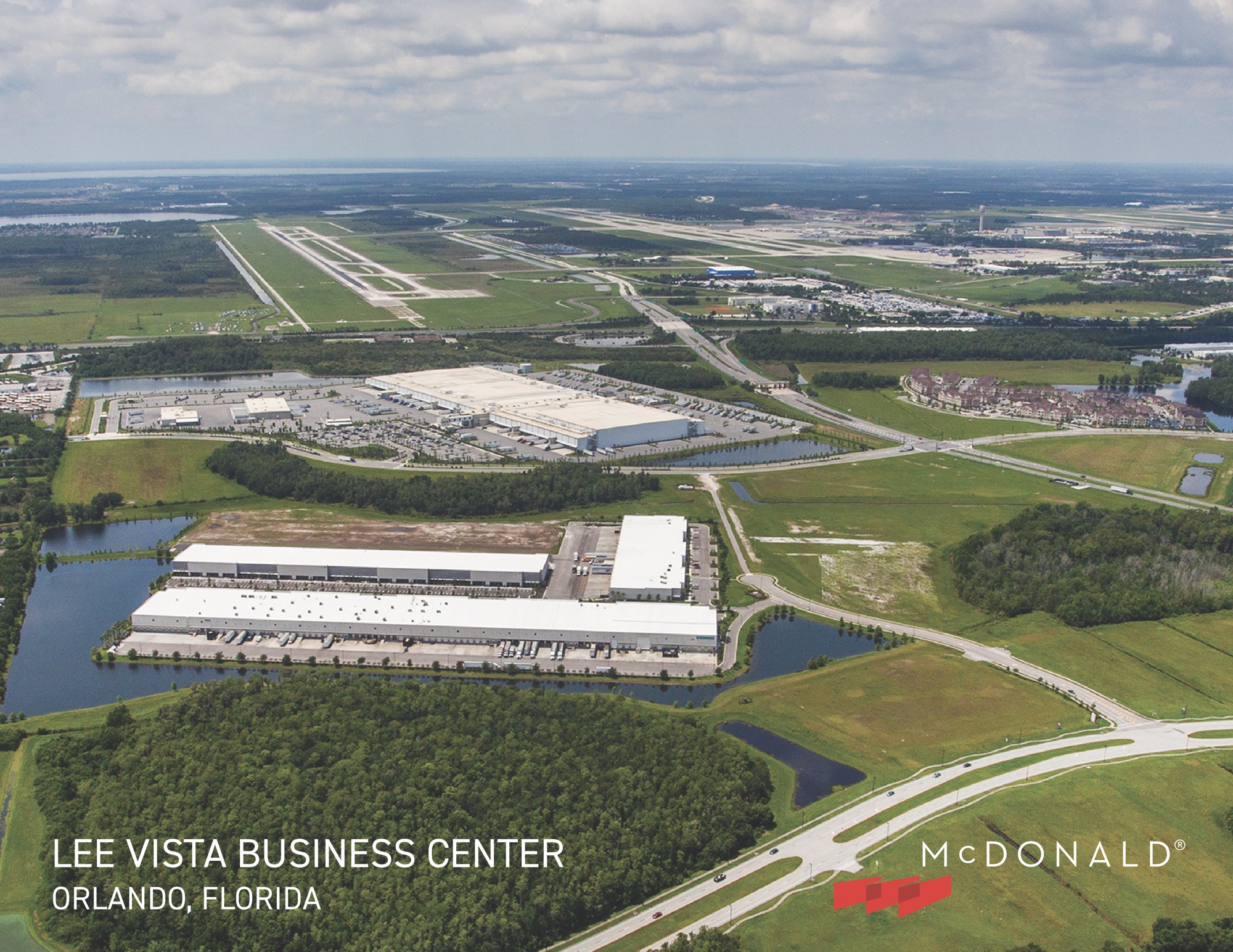 Lee Vista Business Center is an 80.83-acre master-planned business park located within Lee Vista, a 1,900-acre mixed-use development in Orlando, Florida, directly across from Orlando International Airport. The park offers exceptional connectivity with nearby access to the Beachline Expressway, linking to I-75, I-95, I-4, Florida’s Turnpike, and the 417/Central Florida Greeneway. McDonald delivered Phase I in 2009, featuring two rear-load distribution buildings (Buildings D and E) totaling 333,300 square feet. Phase II was completed in 2015 and added a 145,800 square-foot rear-load building (Building F). The Phase I and II buildings were successfully sold in 2016. Phase III, completed in 2018, included a 159,884 square-foot rear-load distribution building (Building G), which was sold in 2019. This phase also included the extension of Emerald Dunes Drive, creating a new connection between Lee Vista Boulevard and Hazeltine National Drive. Land remains available in the park for the development of an additional 290,000 square feet of Class A office and warehouse distribution space.