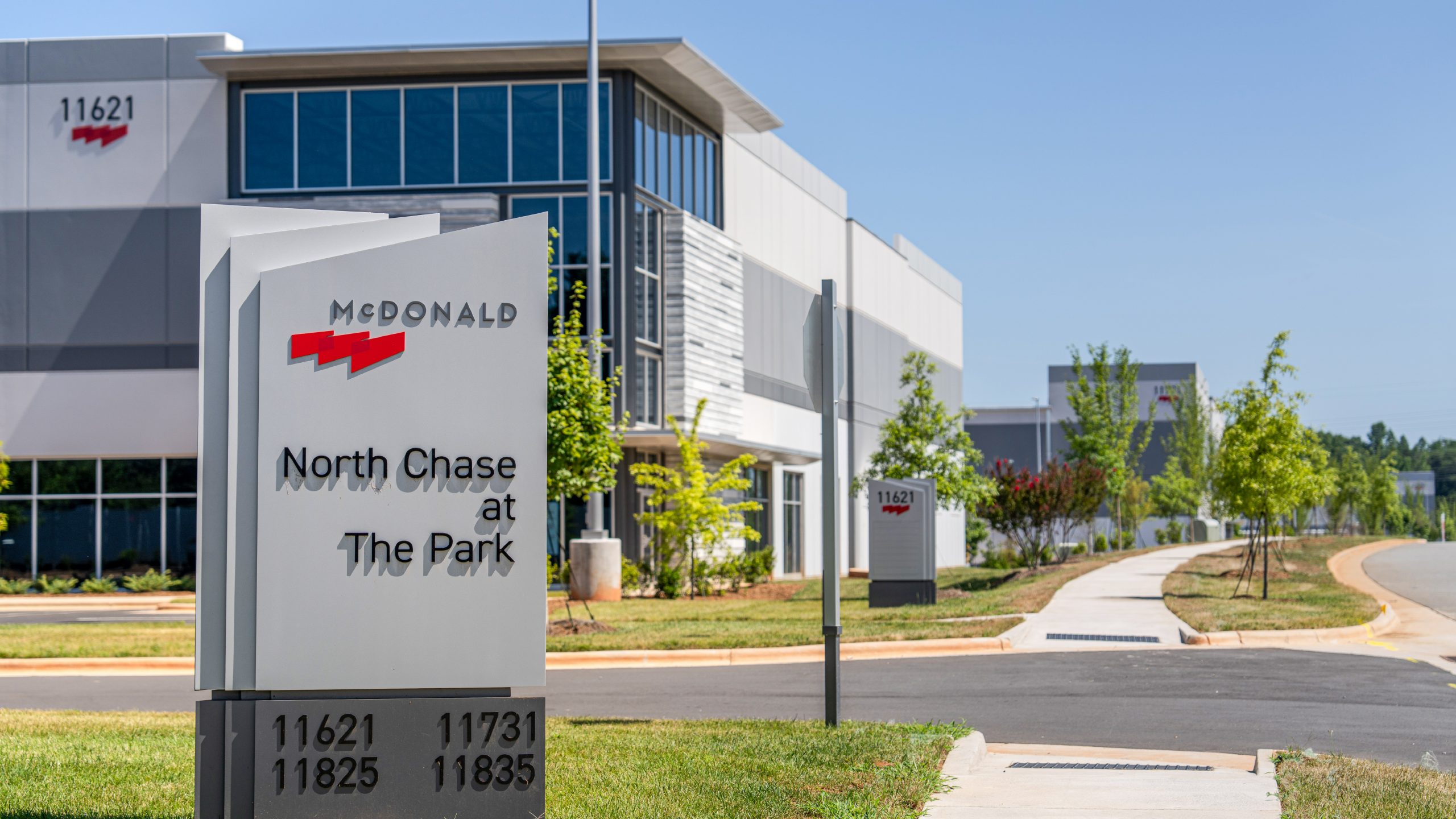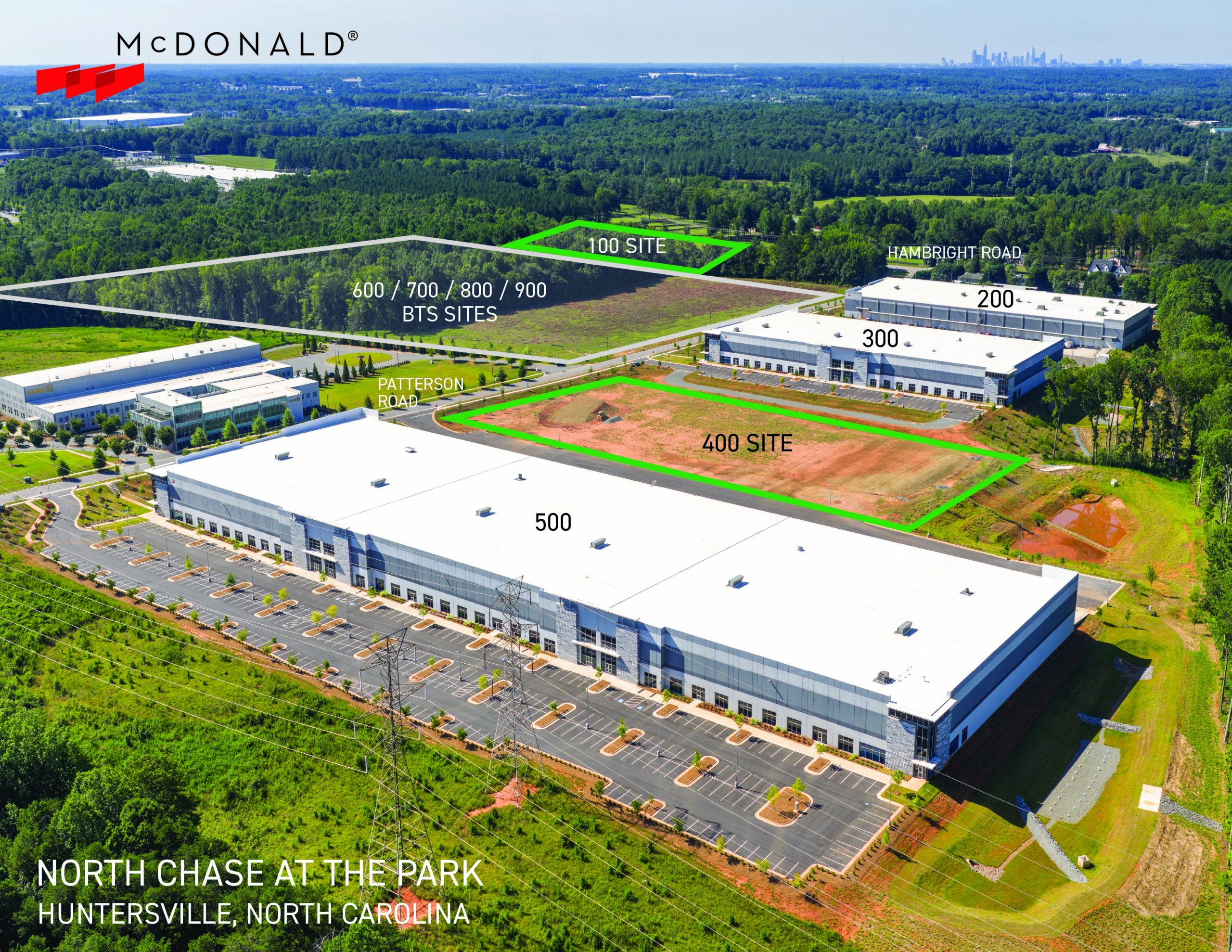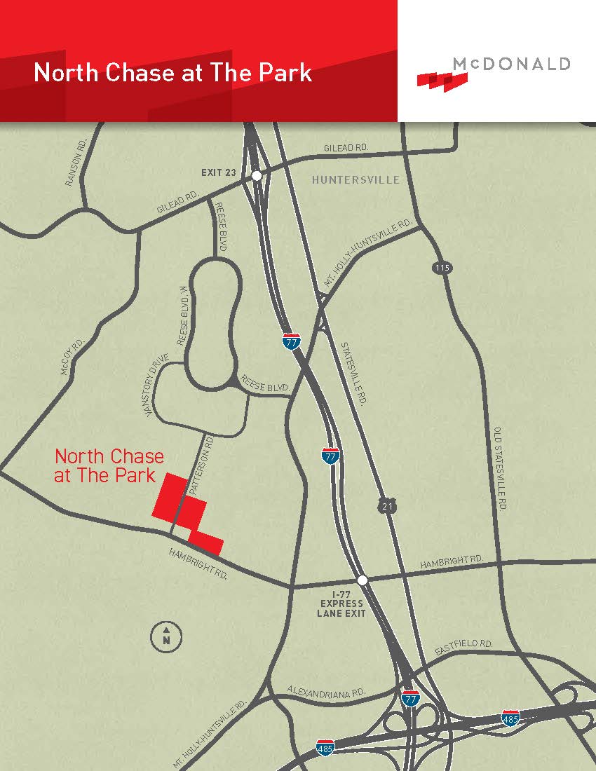 North Chase At The Park is McDonald’s newest business park located in Huntersville, North Carolina, offering convenient access to I-77 via the Hambright Road Express Lanes. Phase I was completed in 2024 and includes three Class A rear-load industrial buildings on 27 acres, ranging in size from 89,065 square feet to 245,134 square feet. The buildings are designed with heavy car parking suitable for manufacturing users. Construction of Phase II has begun, which includes two new rear-load industrial buildings: Builidng 100 containing 201,940 square feet; and Building 400 containing 135,276 square feet. Completion is scheduled for 2Q 2026. Four additional buildings are planned for future phases in the park. At full build-out, the park will contain nine industrial buildings totaling over 1.2 million square feet.