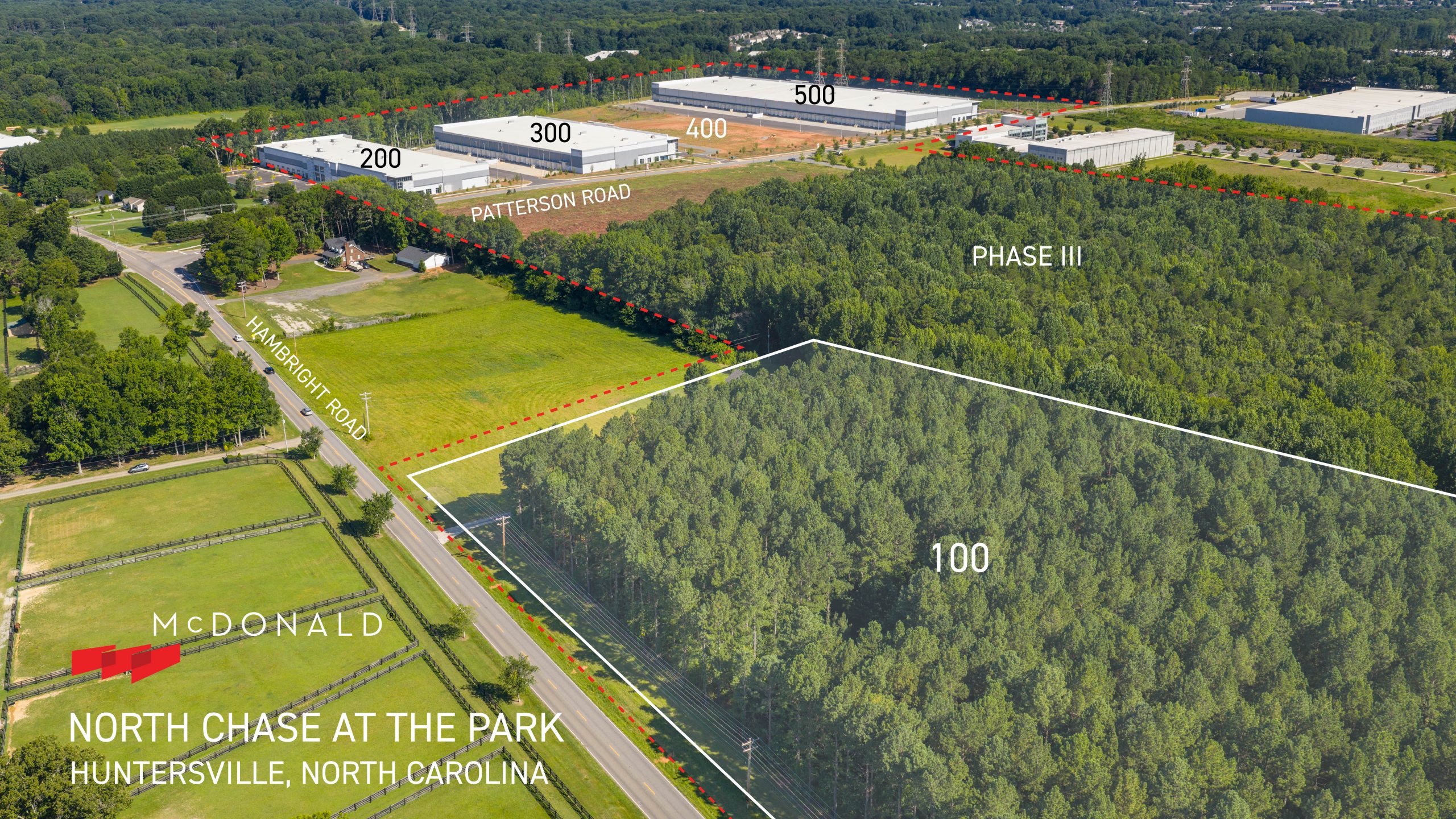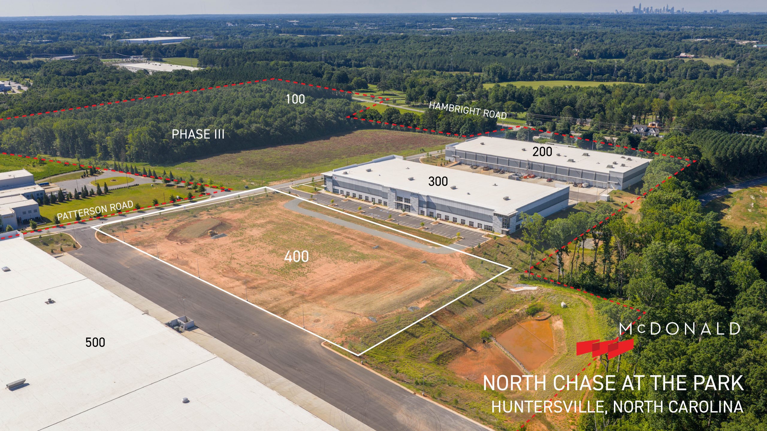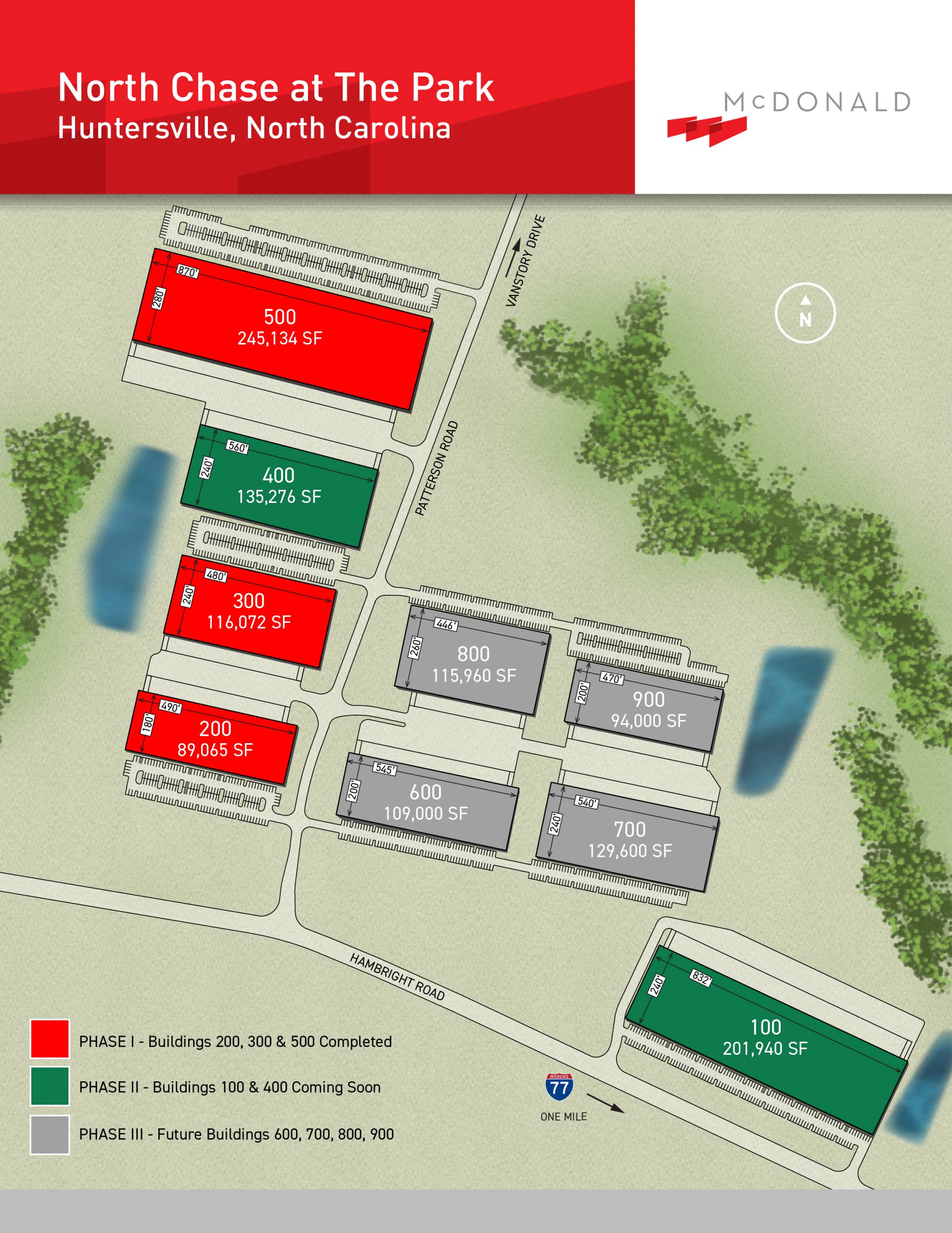 North Chase At The Park is McDonald’s newest business park located in Huntersville, North Carolina, offering convenient access to I-77 via the Hambright Road Express Lanes. Phase I was completed in 2024 and includes three Class A rear-load industrial buildings on 27 acres, ranging in size from 89,065 square feet to 245,134 square feet. The buildings are designed with heavy car parking suitable for manufacturing users. Construction of Phase II has begun, which includes two new rear-load industrial buildings: Builidng 100 containing 201,940 square feet; and Building 400 containing 135,276 square feet. Completion is scheduled for 2Q 2026. Four additional buildings are planned for future phases in the park. At full build-out, the park will contain nine industrial buildings totaling over 1.2 million square feet.