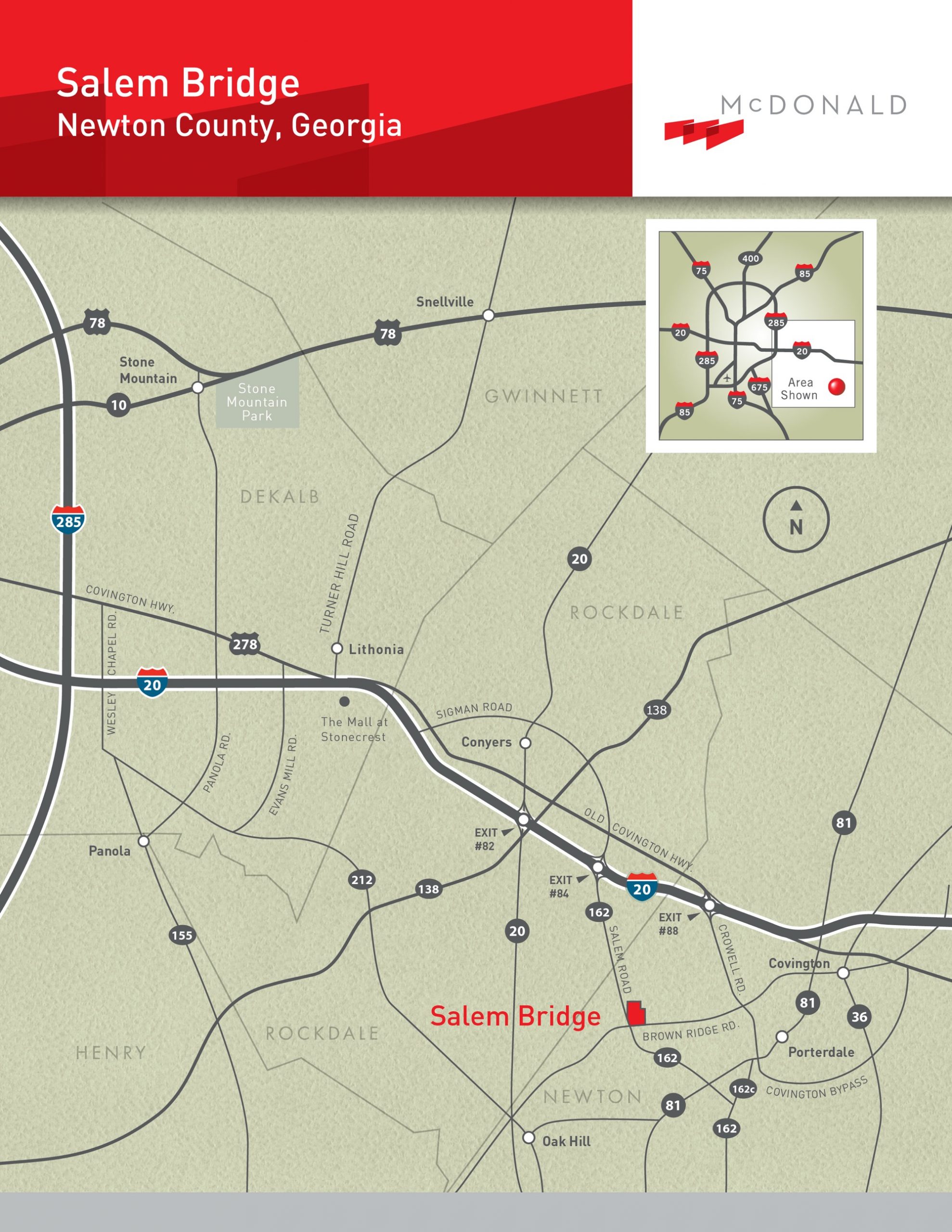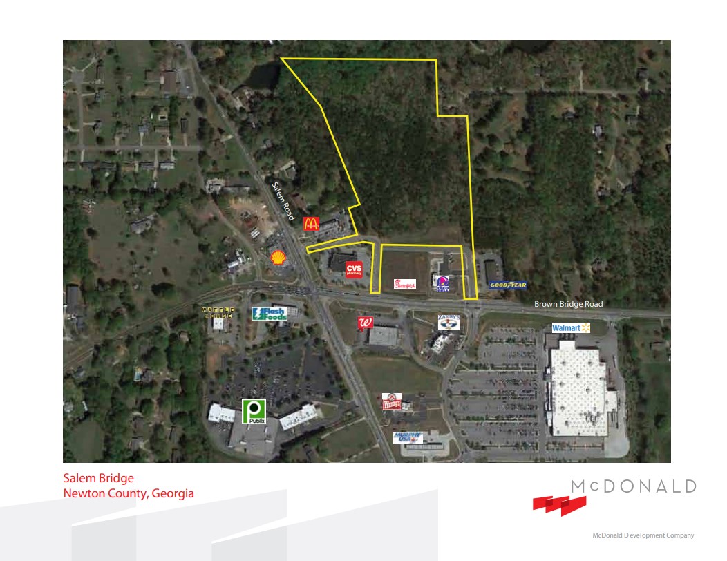 Salem Bridge is an 18.72-acre parcel located near the intersection of Brown Bridge Road and Salem Road in Newton County, Georgia. McDonald has developed several retail outparcels on the site, which now include locations for McDonald’s, CVS, and Taco Bell, with an additional parcel owned by Chick-fil-A. The remaining acreage offers frontage on both Salem Road and Brown Bridge Road and is available for future development in alignment with the Salem Bridge Road Overlay District guidelines established by Newton County.