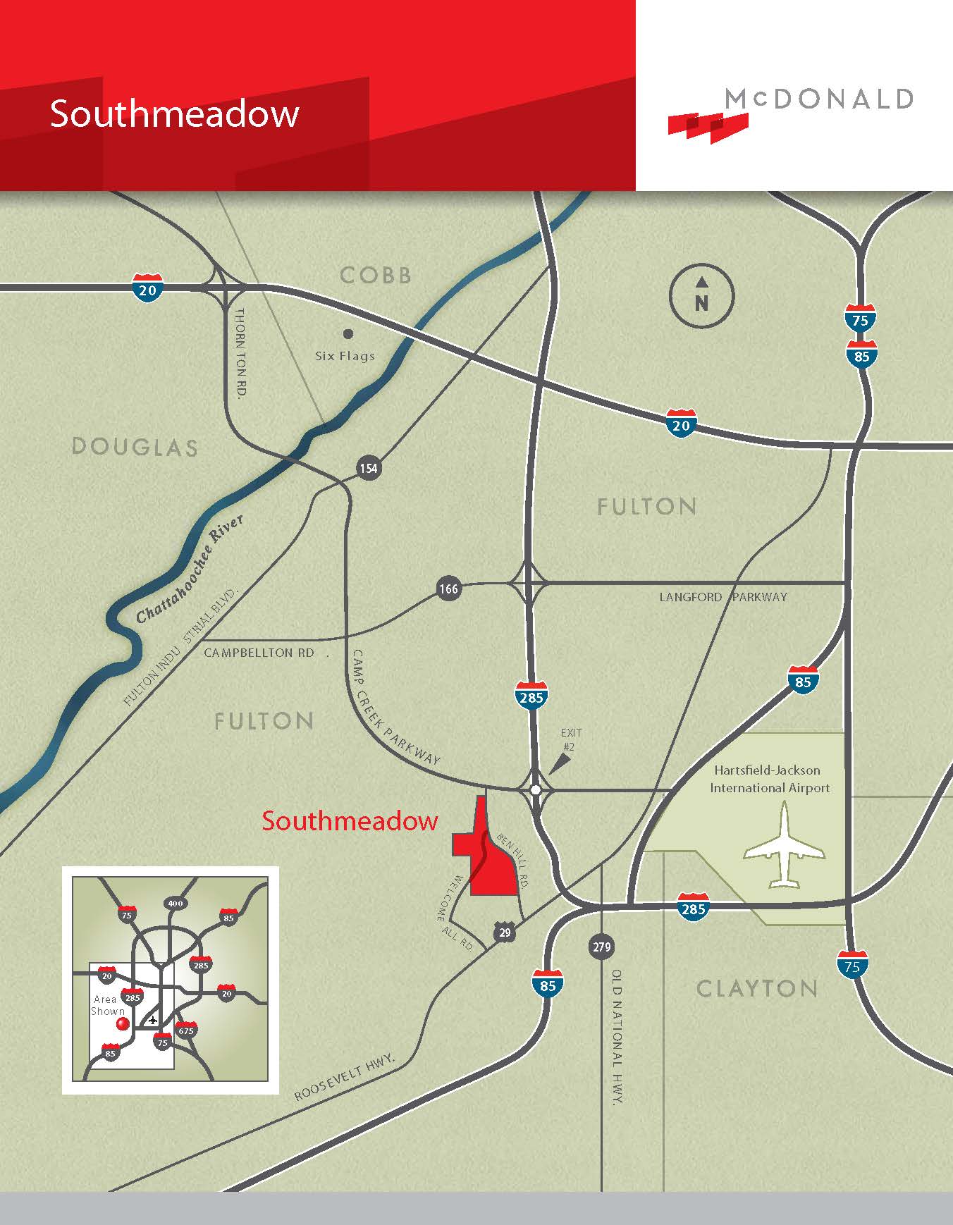 Southmeadow is a 404-acre master-planned business park developed by McDonald in two phases—Southmeadow West and Southmeadow East. Conveniently located just one mile from I-285 off Camp Creek Parkway at Welcome All Road, Since 1997, McDonald has developed, managed, leased, and sold multiple buildings within the park, contributing to its over 2.3 million square feet of existing single and multi-tenant industrial buildings. Upon full build-out, Southmeadow will comprise over 3.8 million square feet of distribution space. McDonald owns sites in the park available for build-to-suit for sale or lease.