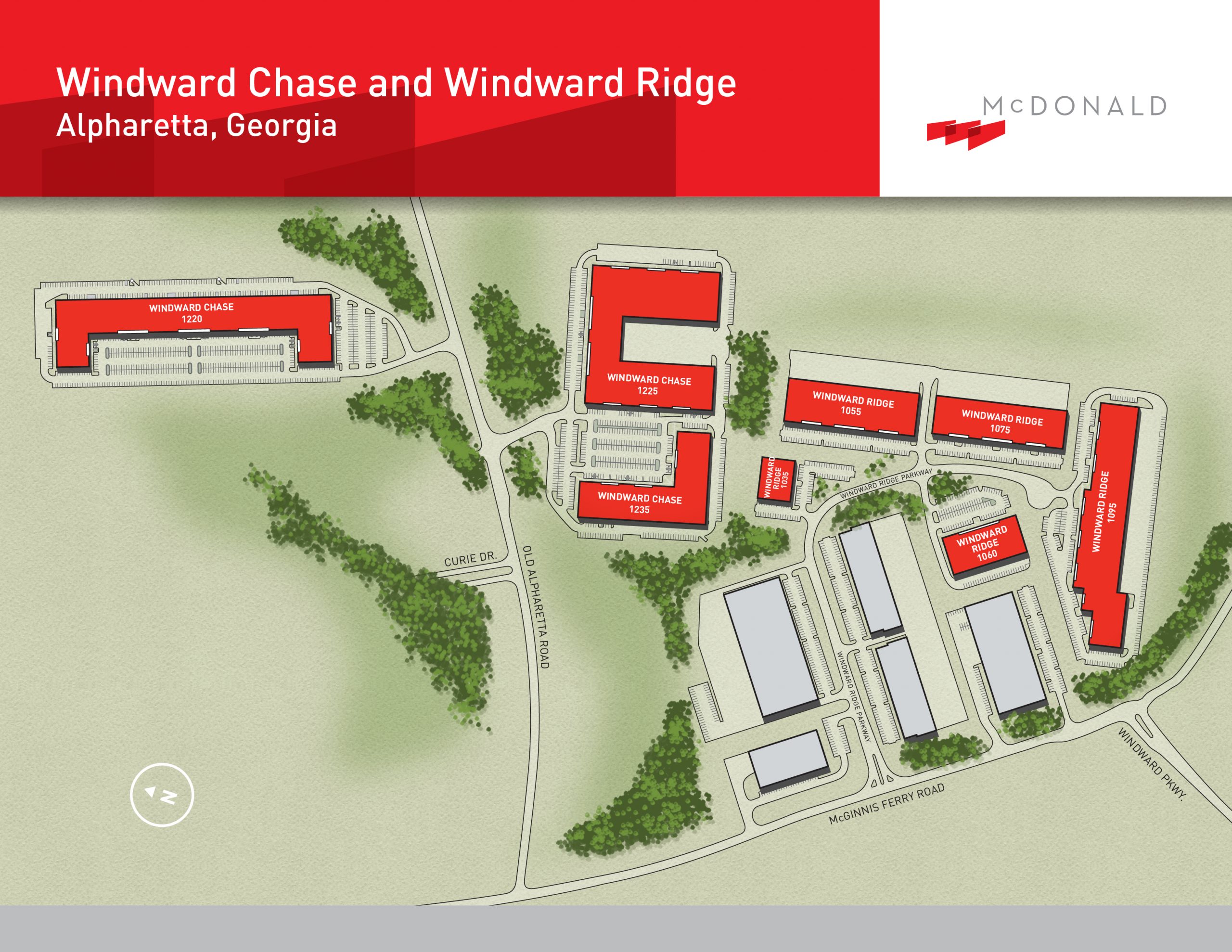 Windward Ridge is a business park developed by McDonald between 1996 and 1999, located on Windward Ridge Parkway at McGinnis Ferry Road near Georgia 400 in Alpharetta, Georgia. The park features a mix of single and multi-tenant rear-load distribution and flex buildings. Windward Ridge is part of the expansive 1,500-acre Windward Business Park, a master-planned community that includes office, industrial, hotel, retail, residential and recreational facilities. McDonald successfully sold its 18,000 square-foot building in 2018, followed by the sale of its remaining four buildings totaling 312,800 square feet in 2021.
