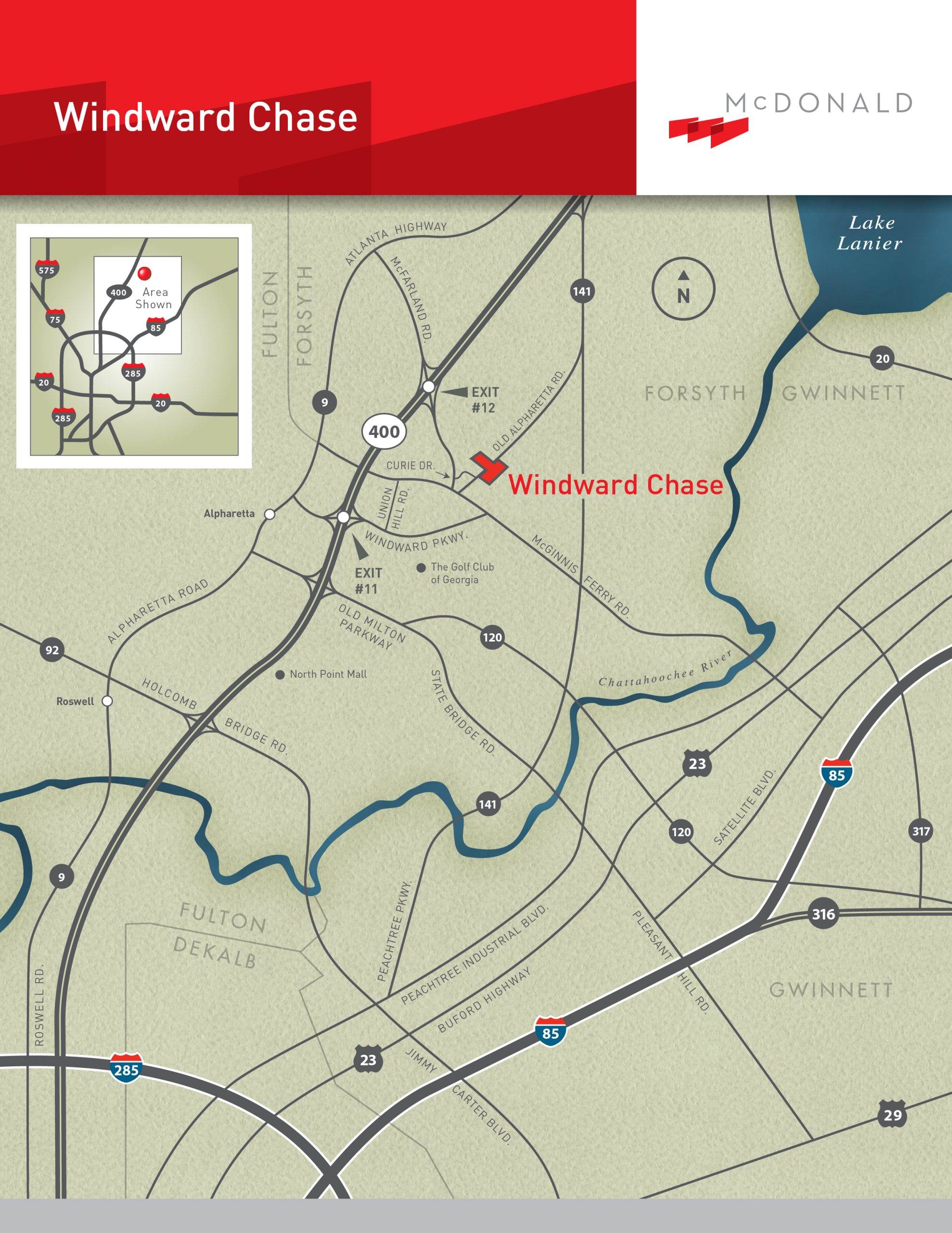 Windward Ridge is a business park developed by McDonald between 1996 and 1999, located on Windward Ridge Parkway at McGinnis Ferry Road near Georgia 400 in Alpharetta, Georgia. The park features a mix of single and multi-tenant rear-load distribution and flex buildings. Windward Ridge is part of the expansive 1,500-acre Windward Business Park, a master-planned community that includes office, industrial, hotel, retail, residential and recreational facilities. McDonald successfully sold its 18,000 square-foot building in 2018, followed by the sale of its remaining four buildings totaling 312,800 square feet in 2021.